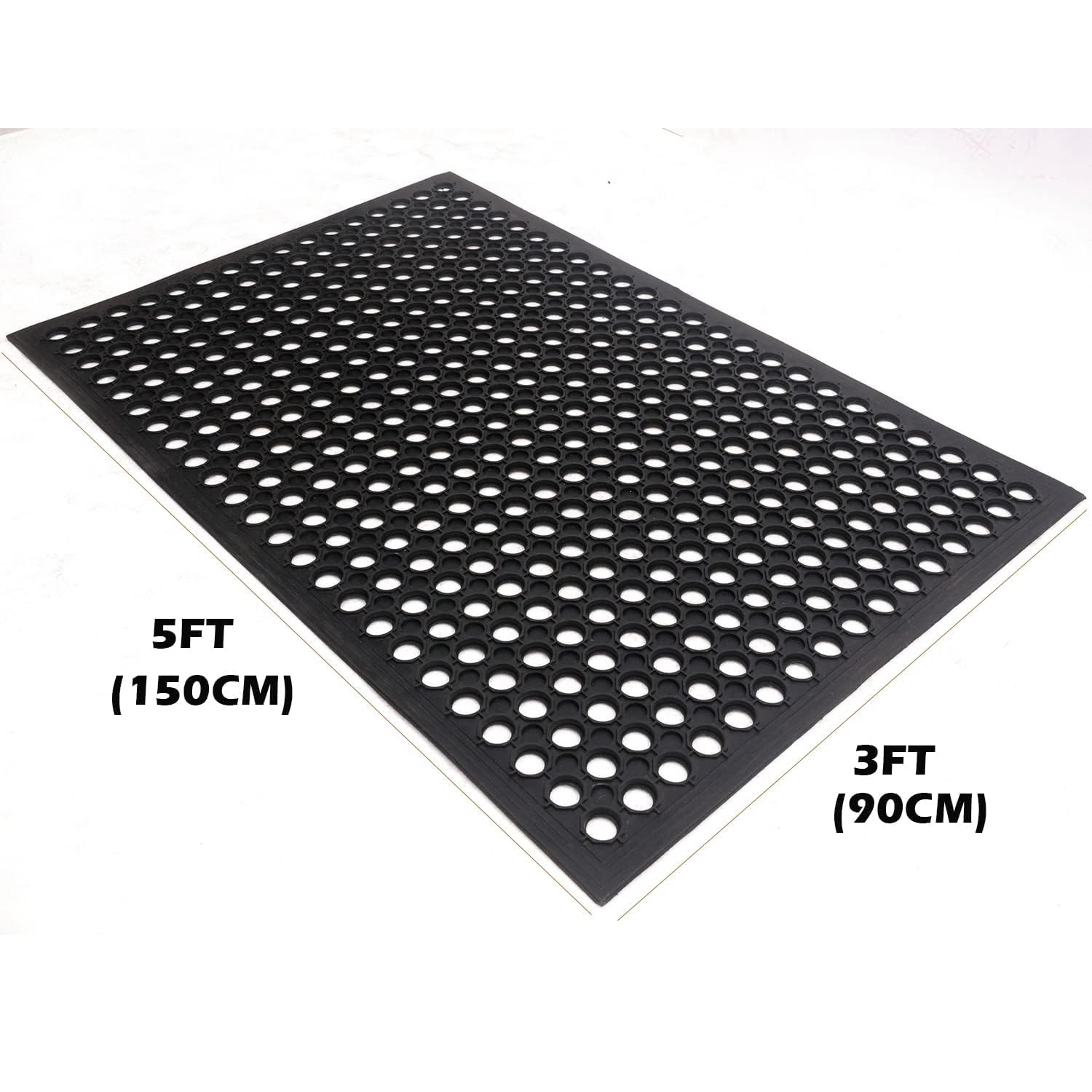 Details: DRAINAGE DESIGN: Honeycomb pattern with raised edges provides excellent liquid drainage and prevents slipping in wet conditions DURABILITY: Heavy-duty rubber construction ensures long-lasting performance and resistance to daily wear and tear VERSATILE USE: Suitable for multiple locations including kitchen, restaurant, entrance, garage, pool area, and other high-traffic zones ANTI-FATIGUE: Thick cushioned surface helps reduce leg and foot fatigue during extended standing periods SAFETY FEATURES: Non-slip textured surface with bevelled edges prevents tripping while keeping the mat securely in place