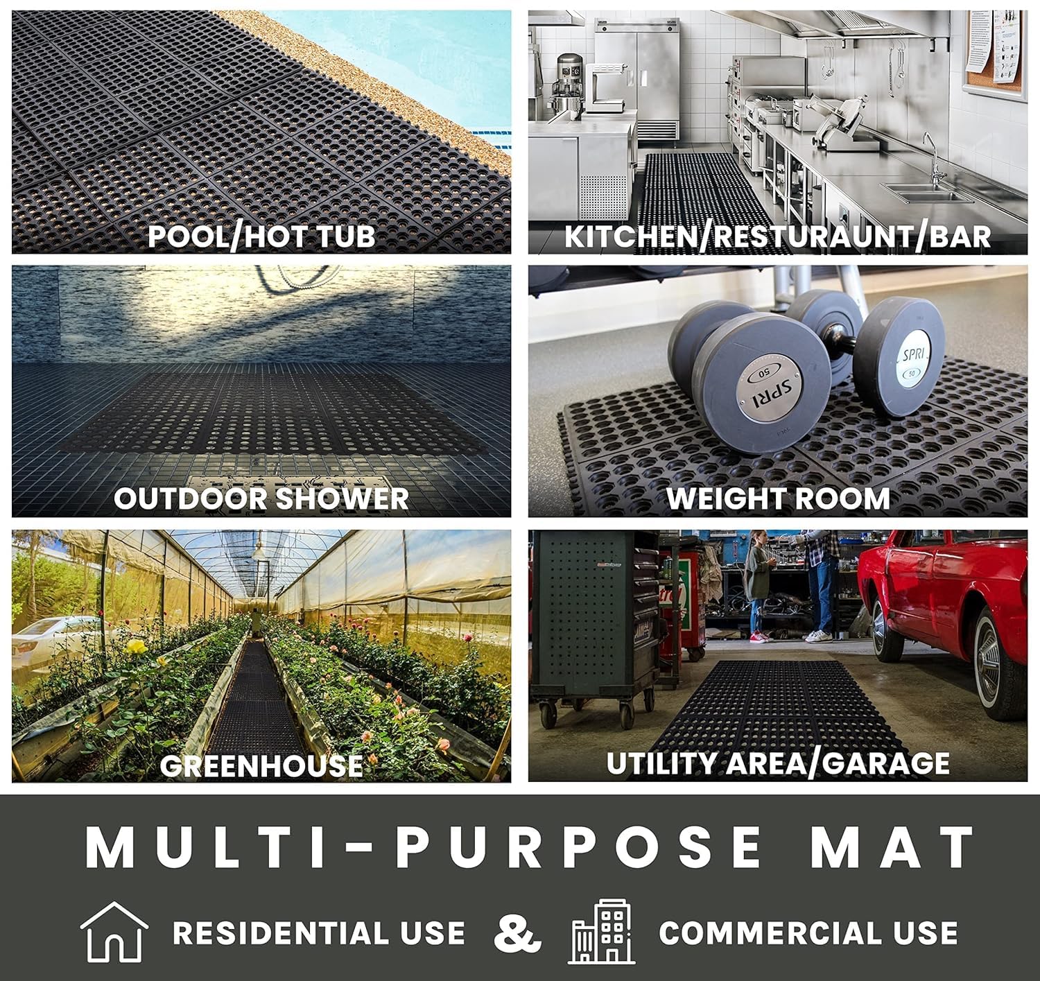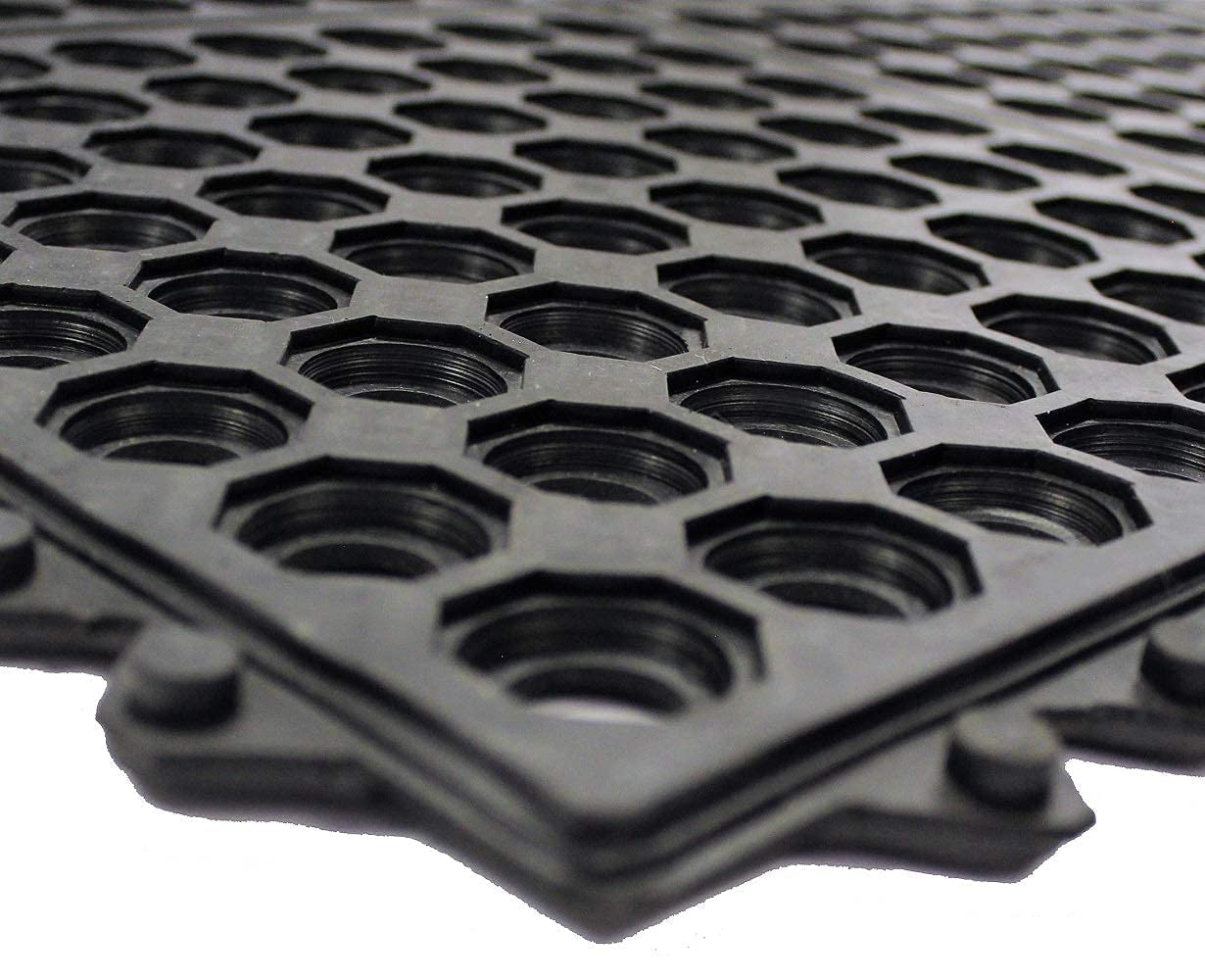 Details: DRAINAGE DESIGN: Honeycomb pattern with raised edges provides excellent liquid drainage and prevents slipping in wet conditions DURABILITY: Heavy-duty rubber construction ensures long-lasting performance and resistance to daily wear and tear VERSATILE USE: Suitable for multiple locations including kitchen, restaurant, entrance, garage, pool area, and other high-traffic zones ANTI-FATIGUE: Thick cushioned surface helps reduce leg and foot fatigue during extended standing periods SAFETY FEATURES: Non-slip textured surface with bevelled edges prevents tripping while keeping the mat securely in place